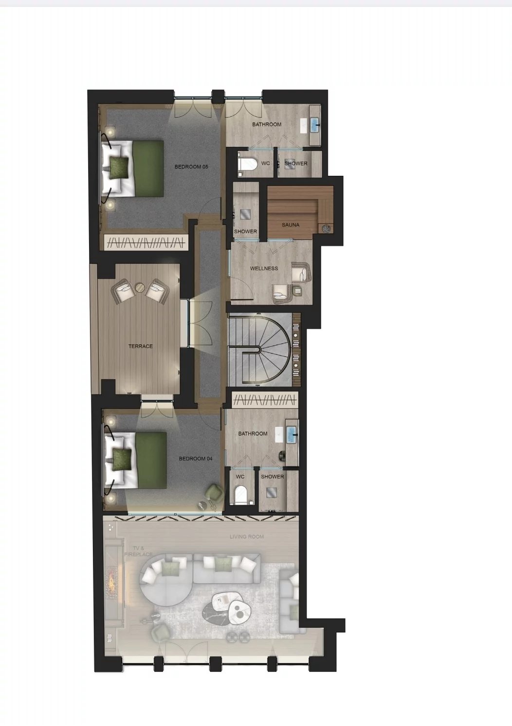 5 chambres spacieuses avec 5 salles de bains attenantes, offrant confort et intimité.